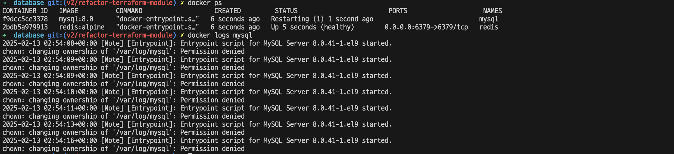 문제는 호스트 머신에서는 root 계정으로 폴더가 만들어져 있었고 이를 MySQL의 컨테이너가 작성하려고 하는 순간 Permission Denied가 떴었던 거였다. (MySQL 컨테이너가 호스트 머신에 root 계정으로 만들어진 폴더에 대해서 접근할 수 있는 권한이 없었기 때문에 생긴 문제)