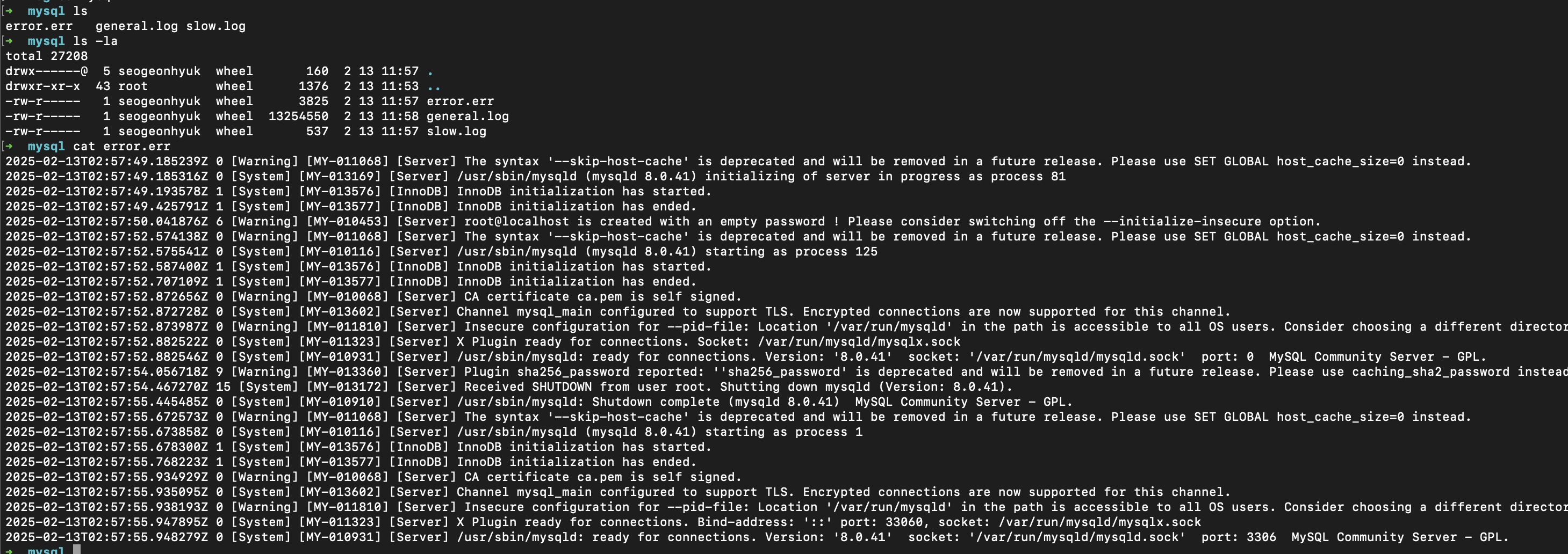 그래서 /var/log/mysql에서 소유자를 도커 소켓을 실행하는 계정으로 바꾸고 여기서 해당 계정으로만 접근이 가능하게끔 chmod 700을 적용하였다.